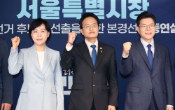 더불어민주당 전현희, 박주민, 정원오 서울시장 예비후보가 5일 서울 여의도 중앙당사에서 열린 서울시장 본경선 후보자 합동연설회에 앞서 기념 촬영을 하고 있다. 연합뉴스 더불어민주당 서울시장 경선에 나선 전현희·박주민 의원과 정원오 전 성동구청장(기호순)이 5일 서…