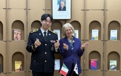 지난달 28일 주한 이탈리아 대사관에 초청된 윤제헌 경감이 에밀리 가토 대사와 기념사진을 찍고 있다. 해양경찰청 지난달 2일 오후 5시30분(현지시각) 이탈리아 밀라노 두오모 광장. 아내와 신혼여행을 즐기던 윤제헌 경감(35·해양경찰 간부후보 67기)은 …