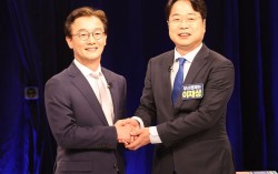 지난 3일 열린 더불어민주당 부산시장 후보 TV 토론회에 참석한 전재수 의원(왼쪽)과 이재성 전 부산시당위원장이 토론에 앞서 악수하고 있다. 송봉근 객원기자 6·3 지방선거를 60여일 앞두고 부산시장에 출마하려는 여야 후보들의 공천 경선이 본격화됐다. 거대 여야…