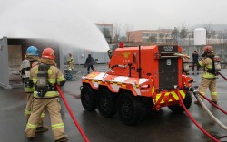 지난 18일 충남 청양 충청소방학교에서 무인소방로봇 ‘단비’ 시연회가 열렸다. [사진 충남도] 지난 18일 오후 충남 청양군 충청소방학교. 아파트 지하주차장 화재를 가상한 진화 훈련이 펼쳐졌다. 수백도가 넘는 고온과 한 치 앞도 내다볼 수 없는 연기로 진…