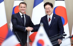 이재명 대통령과 에마뉘엘 마크롱 프랑스 대통령이 3일 청와대에서 열린 한·프랑스 확대 정상회담에서 기념 촬영을 하고 있다. 뉴스1 이재명 대통령과 에마뉘엘 마크롱 프랑스 대통령이 3일 청와대에서 한·불 정상회담을 하고 중동 전쟁의 여파로 인한 경제·에너지 위기 등…