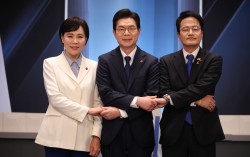 더불어민주당 전현희(왼쪽부터), 정원오, 박주민 서울시장 예비후보가 3일 서울 여의도 KBS 스튜디오에서 열린 더불어민주당 서울시장 본경선 후보자 2차 합동토론회에서 기념촬영을 하고 있다. 뉴시스 더불어민주당 서울시장 본경선 TV 토론회에서 후보들이 부동…