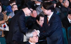 19일 두산 베어스와 시범경기에서 2회 2점 홈런을 친 롯데 자이언츠 윤동희(오른쪽)가 전준우와 세리머리를 하고 있다. 10-3으로 이긴 롯데는 시범경기 5승 2무를 기록했다. 12번째 시범경기 1위를 향해 순항 중이다. [연합뉴스] 프로야구 롯데 자이언…