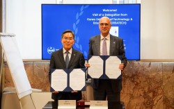 유길상 한국기술교육대 총장이 12월 2일(화) 이탈리아 토리노공과대학 삭키 부총장과 업무협약을 맺고 기념촬영을 하는 모습 한국기술교육대학교(KOREATECH·총장 유길상)가 글로벌 직업교육훈련 확대를 위해 ILO(국제노동기구)와 협력에 박차를 가하고 있다…