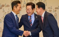 이재명 대통령이 지난해 9월 8일 서울 용산 대통령실 청사에서 열린 여야 지도부 오찬 회동에서 정청래 더불어민주당 대표, 장동혁 국민의힘 대표가 악수하는 것을 보고 미소를 짓고 있다. 뉴스1 이재명 대통령이 오는 7일 여야 지도부와 정부가 함께하는 ‘여야정 민생경…