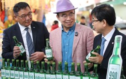 ‘착한소주’가 나왔다. 왼쪽부터 김재면 수퍼체인유통협동조합 이사장, 조웅래 선양소주 회장, 인태연 소상공인진흥공단 이사장. [뉴스1] 선양소주가 동네 수퍼마켓 한정으로 990원 소주를 공급한다. 대형 유통채널·이커머스와의 경쟁으로 어려움을 겪는 골목상권에…