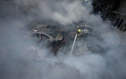 8일(현지시간) 레바논 베이루트의 한 아파트 건물이 이스라엘군의 공습을 받아 파괴된 가운데, 소방대원이 잔해 속에서 불길을 잡고 있다. AP=연합뉴스 미국과 이란의 2주간 휴전이 발효된 첫날인 8일(현지시간) 이스라엘이 레바논 무장정파 헤즈볼라를 겨냥해 …