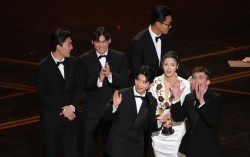 지난 15일(현지시간) 미국 로스앤젤레스(LA) 돌비 극장에서 열린 제98회 아카데미(오스카) 시상식 수상소감을 위해 시간을 더 달라고 요청하는 '케데헌' 작곡·작사팀. AP=연합뉴스 제98회 아카데미(오스카) 시상식에서 넷플릭스 애니메이션 ‘케이팝 데몬…