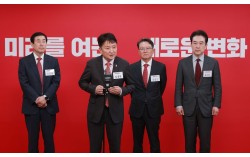 6·3 지방선거 충북지사에 도전하는 국민의힘 예비후보들이 11일 서울 영등포구 여의도 국민의힘 중앙당사에서 열린 광역단체장 후보 면접을 마치고 취재진 질문에 답하고 있다. 왼쪽부터 조길형 전 충주시장, 김영환 충북지사, 윤갑근 변호사, 윤희근 전 경찰청장. 연합뉴스 …