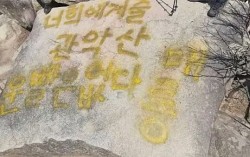 최근 관악산 마당바위에 적힌 래커 낙서. “너희에게 줄 관악산 운빨은 없다. 메롱”이라고 적혀있다. 사진 스레드 운세 명당으로 입소문을 타며 젊은 층 등 등산객 발길이 이어지고 있는 관악산이 최근 래커 낙서로 오염됐다. 서울 관악구청은 훼손된 바위를 복원…