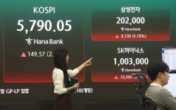 코스피가 2%대 상승 출발한 18일 오전 서울 중구 하나은행 딜링룸 현황판에 코스피 지수와 삼성전자 주가가 표시되고 있다. 뉴스1 18일 장중 코스피200 선물 가격이 5% 이상 급등하면서 유가증권시장에 매수 사이드카가 발동됐다. 한국거래소는 이날 오후 2시…