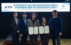 ▲ 한국공학대학교 첨단산업(미래자동차) 인재양성 부트캠프사업단과 한국화학융합시험연구원(KTR)이 배터리 안전성 평가 및 전문인력 양성을 위한 업무협약(MOU)을 체결한 뒤 기념촬영을 하고 있다. 사진 가운데는 한국공학대 서석현 교수(3번째)와 KTR 김미성 본부장(4번…