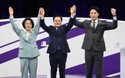 더불어민주당 추미애, 김동연, 한준호 경기도지사 경선후보(왼쪽부터)가 지난달 30일 상암동 MBC 신사옥에서 열린 '더불어민주당 경기도지사 후보자 합동토론회'에서 기념촬영을 하고 있다. 연합뉴스 6·3 지방선거 더불어민주당 경기도지사 후보 본경선을 앞두고 실시된 …