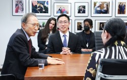 이명박 전 대통령이 17일 오후 서울 서초동 사무실에서 하버드 공공정책행정대학원 케네디스쿨 대학원생 들과 면담했다. 우상조 기자 이명박(MB) 전 대통령이 17일 세계 각국 출신의 미국 하버드대 대학원생들과 만나 기업가 정신을 접목한 국가 경영의 필요성을 강조했다…
