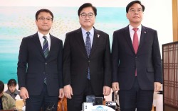 지난 12일 우원식 국회의장이 국회에서 열린 의장 주재 여야 원내대표 회동에서 기념촬영을 하고 있다. 왼쪽부터 한병도 더불어민주당 원내대표, 우 의장, 송언석 국민의힘 원내대표. 임현동 기자 우원식 국회의장이 17일 더불어민주당과 국민의힘 양당에 '검찰 조작기소 …