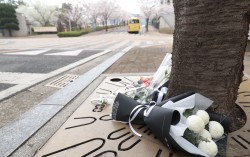 31일 울산 북구 신천동의 아파트 단지 내 도로변에 교통사고로 숨진 초등학생을 추모하기 위한 꽃들과 과자가 놓여있다. 뉴스1 울산의 한 아파트 단지에서 학원 차량에서 내려 귀가하던 초등학생이 스포츠유틸리티차(SUV)에 치여 숨지는 사고가 났다. 31…