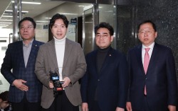 국민의힘 박성훈 수석대변인 등 부산 지역 의원들이 17일 국회에서 부산시장 후보 공천과 관련해 장동혁 대표와 면담한 뒤 면담 내용을 설명하고 있다.연합뉴스 장동혁 국민의힘 대표가 17일 박형준 부산시장 공천배제를 반대하며 자신을 찾은 부산지역 의원들과 면담하면서 …