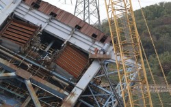 한국동서발전 울산화력발전소 보일러 타워 붕괴 사고 현장. 크레인으로 5호기 상부 구조물을 고정하는 작업이 이뤄지는 모습. 뉴스1 한국동서발전 울산화력발전소 보일러 타워 5호기 붕괴 사고 발생 8일째인 13일 오전 1시쯤 소방당국은 30대 남성 매몰자 1…