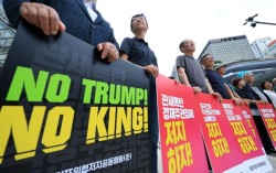 트럼프위협저지공동행동 활동가 등이 30일 오전 서울 중구 포스트타워 앞에서 한미 관세조치 공청회 대응행동을 하고 있다. 2025.6.30/뉴스1 오는 8일 상호관세 유예 시한을 앞두고 도널드 트럼프 미국 대통령이 일본ㆍ한국 같은 주요 무역 상대국을 겨냥해…