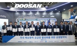 정연인 두산에너빌리티 부회장(가운데)이 ‘2025 해상풍력 공급망 컨퍼런스 전시회’에서 국내 9개 협력사 대표들과 상생협약을 체결하고 기념촬영을 하고 있다. 사진 두산에너빌리티 두산에너빌리티는 부산 벡스코에서 개막한 ‘2025 해상풍력 공급망 콘퍼런스 전…