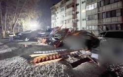1일 오전 강원 속초시 교동 한 아파트 주차장에 지붕 구조물이 날아들어 차량 6대가 파손됐다. 사진은 파손된 차량. 사진 강원특별자치도소방본부 강원 속초의 한 아파트에서 강풍에 날아온 지붕 구조물이 주차된 차량 여러 대를 덮치는 사고가 발생했다. 소…