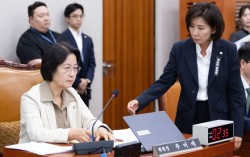 10월 16일 서울 여의도 국회에서 열린 법제사법위원회 감사원 등에 대한 국정감사에서 나경원 국민의힘 의원이 추미애 위원장에게 말을 걸고 있다. 뉴스1 대장동 사건 항소 포기를 둘러싼 여야의 국정조사 줄다리기가 다시 팽팽해졌다. 나경원 국민의힘 법사위원의 간사 선…