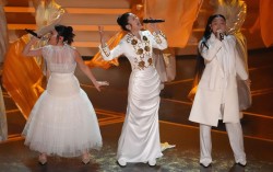 레이 아미, 이재, 오드리 누나(왼쪽부터)가 15일(현지시간) 미국 로스엔젤레스(LA) 할리우드 돌비극장에서 열린 제98회 오스카 시상식 무대에서 '골든'(Golden) 공연을 하고 있다. AP=연합뉴스 넷플릭스 인기 애니메이션 영화 '케이팝 데몬 헌터스'가 영화…