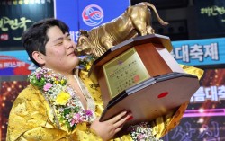 천하장사에게 수여하는 황소트로피에 입 맞추는 김민재. 사진 대한씨름협회 2025년에도 모래판 지존은 김민재(23·영암군민속씨름단)였다. ‘씨름 괴물’이라는 별명답게 절대강자의 지위를 지켜냈다. 김민재는 지난 29일 경북 …