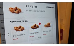 15일 서울 영등포구의 한 KFC 매장 내 키오스크에 '오리지널 치킨' 가격이 표시돼있다. 이날 오리지널 치킨 3조각 기준 가격은 1만600원이다. 노유림 기자 15일 서울 영등포구에 있는 한 KFC 매장. 주말 점심시간이었지만 식사하는 사람이 별로 없어…