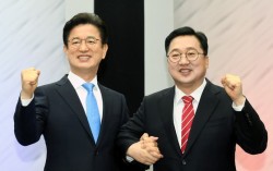 지난 2022년 지방선거 당시 열린 대전시장 후보자 초청 토론회에서 허태정 더불어민주당 후보(왼쪽)와 이장우 국민의힘 후보(현 대전시장)이 포즈를 취했던 모습. 뉴스1 6·3 지방선거 대전시장 선거가 더불어민주당 허태정 전 시장과 국민의힘 이장우 현 시장의 재대결…