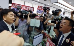 전주·완주 통합을 추진 중인 김관영 전북지사(왼쪽)가 지난 7월 21일 완주군 삼례읍 행정복지센터에서 전입 신고를 하자 유의식 완주군의회 의장(오른쪽)이 항의하고 있다. 애초 김 지사 부부는 전주시 효자동 도청 인근 전세 아파트에 거주했지만, 주소지는 김 지사 고향인 …