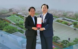 우오현 SM그룹 회장(오른쪽)이 지난 12일 서울 서대문구 독립문문화공원에서 공영주차장 신축으로 주민 편의를 제공한 것에 대한 공로로 이성헌 서대문구청장에게 감사패를 받고 있다. 사진 SM그룹 우오현 SM그룹 회장이 독립문 공영주차장 조성으로 시민 편의를…