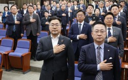 박찬대 더불어민주당 원내대표와 박성준 원내수석부대표가 지난 2일 서울 여의도 국회에서 열린 비상의원총회에서 국기에 경례를 하고 있다. 뉴스1 6·3 대선 승리로 여당이 된 더불어민주당이 오는 13일 ‘이재명 정부’ 출범 이후 첫 원내대표를 선출한다. 새 …