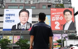 제21대 대통령선거를 하루 앞둔 지난 2일 경기 의왕시 한 주상복합 건물 외벽에 이재명 더불어민주당 대선후보, 김문수 국민의힘 대선후보의 대형 현수막이 걸려 있다. 뉴시스 제21대 대통령 선거 본투표가 3일 오전 6시부터 전국 투표소 1만4295곳에서 일제히 시작…