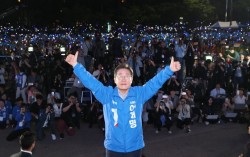 이재명 더불어민주당 대선후보가 2일 오후 서울 여의도공원에서 열린 마지막 유세에 앞서 양손으로 엄지를 들어 보이고 있다. 이 후보는 이날 서울 강북구를 시작으로 경기도 하남·성남·광명시를 거쳐 서울 마곡·여의도까지 이어지는 유세를 펼쳤다.