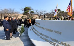 방한 중인 마이클 디솜브레 미 국무부 동아시아·태평양 담당 차관보가 13일 오전 주한미군 전사자 추모비를 찾아 헌화했다. 지난달 25일 추모비 제막 이후 진행되는 첫 공식 헌화 행사에 미 정부 고위 당국자가 참여해 의미를 더한 것이다. 한미동맹재단에 따르면 디솜브…