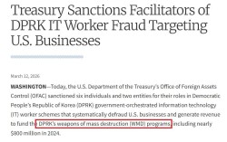 미국 재무부가 12일(현지시간) 미국 기업에 IT(정보기술) 기술자들을 위장 취업시켜 민감한 정보를 탈취하고 핵 프로그램을 비롯한 대량살상무기(WMD) 개발 자금을 북한으로 송금한 혐의로 개인 6명과 기관 2곳을 대북제재 목록에 추가했다. 미 재무부는 12일(현지시간)…
