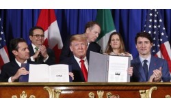 지난 2018년 열린 美·멕시코·캐나다 협정 서명식에 참석한 3국 정상. 왼쪽부터 엔리케 페냐 니에토 멕시코 대통령, 도널드 트럼프 미국 대통령, 쥐스탱 트뤼도 캐나다 총리. AP=연합뉴스 멕시코가 도널드 트럼프 1기 행정부 시절 북미자유무역협정(NAFT…