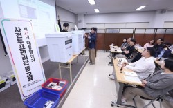제21대 대통령선거 사전투표(5월 29일~30일) 시작을 사흘 앞둔 26일 오후 서울 중랑구 선거관리위원회에서 사전투표 관리관들이 공정선거참관단의 참관 아래 교육을 받고 있다. 뉴스1 제21대 대선 사전투표가 이틀 앞으로 다가온 가운데 온라인에선 이와 관…