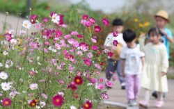 지난달 10일 오후 경북 경산시 하양읍 대부잠수교 옆 하양경관농업단지로 나들이 나온 어린이들이 활짝 핀 코스모스를 따라 산책하고 있다. 뉴스1 아내 임금이 높을수록 남편이 육아·가사에 더 많이 참여하고, 남편이 일찍 퇴근할수록 아내의 가사 부담이 줄어든다…