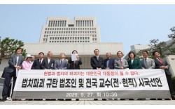 전현직 법조인과 전국 교수 등이 27일 서울 서초구 대법원 정문 앞에서 '헌법과 법치의 파괴자는 대통령이 될 수 없다' 법치파괴 규탄 법조인 및 전국 교수 1004인 시국선언을 하고 있다. 이들은 ″사법부 독립은 민주주의의 최후 보루″라며 ″3권분립과 헌법질서를 파괴…