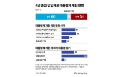 김영옥 기자 중앙일보가 한국갤럽에 의뢰해 지난 24~25일 실시한 여론조사에서 현행 대통령 5년 단임제를 4년 중임 또는 연임으로 바꾸는 개헌 필요성을 묻는 질문에 ‘찬성한다’는 응답이 60%였다. ‘반대한다’는 31%, ‘모름·응답 거절’은 8%였다. …