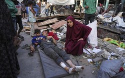 26일(현지시간) 이스라엘군의 공격으로 팔레스타인 가자지구에서 최소 36명이 사망한 가운데, 난민들이 대피소로 사용하는 학교에 모여 있다. AP=연합뉴스 세계보건기구(WHO)는 26일(현지시간) 팔레스타인 가자지구의 의료 장비 대부분이 고갈됐으며 기본 의약품의 재…