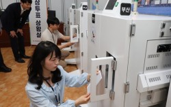 제21대 대통령선거 선상투표가 시작된 26일 부산시 선관위 상황실 직원들이 기표 부분을 봉합한 상태로 수신하는 ‘실드팩스’로 전송된 투표용지를 접수하고 있다. 오는 29일까지 실시하는 선상투표는 대한민국 국민이 선장인 원양어선 등 선박 454척에 승선하고 있는 유권자 …