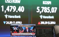 미국과 이란이 2주간 휴전에 사실상 합의한 8일 서울 중구 하나은행 본점 딜링룸에 도널드 트럼프 미국 대통령 관련 뉴스와 원/달러 환율, 코스피가 표시되고 있다. 연합뉴스 미국과 이란이 2주 휴전안에 합의하면서 원·달러 환율이 하루 만에 급락(원화 가치는…