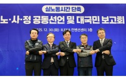지난해 12월30일 오후 서울 중구 서울 R.ENA 컨벤션센터에서 열린 '실노동시간 단축' 노·사·정 공동선언 및 대국민 보고회에서 관계자들이 기념 촬영을 하고 있다. 왼쪽부터 강석윤 한국노총 상임부위원장, 이동근 한국경영자총협회 상근부회장, 김영훈 고용노동부 장관, …
