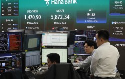미국과 이란이 2주간의 휴전에 사실상 합의한 가운데 8일 서울 중구 하나은행 본점 딜링룸 현황판에 코스피지수 등이 표시돼 있다. 이날 코스피는 전장 대비 377.56포인트(6.87%) 오른 5,872.34로, 코스닥 지수는 53.12포인트(5.12%) 오른 1,089.…