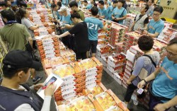대구 북구 대구농수산물도매시장에서 중도매인들이 경매에 나온 복숭아를 살펴보고 있다. 중앙포토 대구농수산물도매시장이 2032년 북구에서 달성군으로 이전하면서 전국 최초로 온라인 물류센터가 들어서는 등 첨단 도매시장으로 재탄생한다. 대구시는 27일 ‘대…