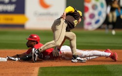 메이저리그(MLB) 샌디에이고 파드리스에 입단한 내야수 송성문(30)이 시범경기 첫 안타를 쳤다. 27일(한국시간) 신시내티와의 시범경기에서 2루 수비를 하는 송성문(오른쪽). AP=연합뉴스 송성문은 27일(한국시간) 미국 애리조나주 굿이어 볼파크에서 …