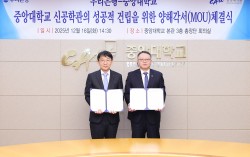 중앙대-우리은행 업무협약 체결식 사진. 중앙대 박상규 총장(왼쪽)과 우리은행 정진완 은행장 중앙대학교(총장 박상규)가 16일 우리은행(은행장 정진완)과 서울캠퍼스 총장실에서 ‘첨단공학관 건립’을 위한 업무협약(MOU)을 체결했다고 밝혔다. 협약식에는…